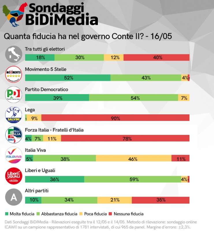 Sondaggio Bidimedia: col lockdown continua il crollo della Lega, risale Pd e fiducia in Conte