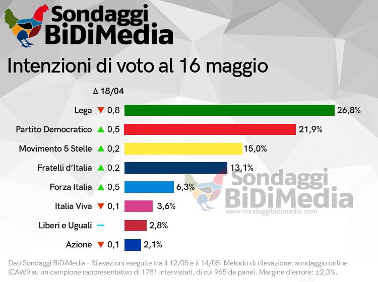 Ancora un forte calo della Lega di Matteo Salvini nella rilevazione di giugno effettuata dall’istituto di sondaggi Bidimedia. Nelle intenzioni di voto al 16 maggio il Carroccio vede restringersi la distanza che lo separa dal Partito Democratico, che si fa sempre più vicino, mentre prosegue anche il momento positivo per Movimento 5 Stelle e Fratelli d’Italia.