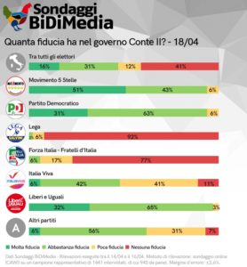 LA FIDUCIA NEL GOVERNO – Il periodo emergenziale fa salire anche la fiducia nell’esecutivo guidato dal premier Giuseppe Conte. Il dato arriva infatti al 47% (16% ha molta fiducia, 31% abbastanza fiducia), col gradimento personale del presidente del Consiglio che supera il 90% tra gli elettori del Pd e del Movimento 5 Stelle e che non raggiunge il 50% tra quelli di Italia Viva. Netta invece la bocciatura tra l’elettorato della Lega (98%) e Forza Italia-Fratelli d’Italia (94%).