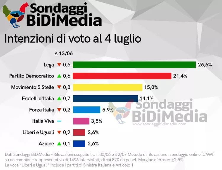 LE INTENZIONI DI VOTO – Il periodo negativo per il Carroccio prosegue da tempo, e anche nel sondaggio del 4 luglio di Bidimedia la Lega viene data in calo dello 0,6%, a quota 26,6%. La stessa percentuale viene guadagnata dai ‘rivali’ del Partito Democratico, che si portano sopra quota 21 per cento. Dietro il Movimento 5 Stelle paga un momento critico, con le aspre divisioni all’interno, scendendo al 15% (-0,3%). Bene invece Fratelli d’Italia che si porta a meno di un punto dai pentastellati, guadagnando lo 0,7% nell’ultimo mese.