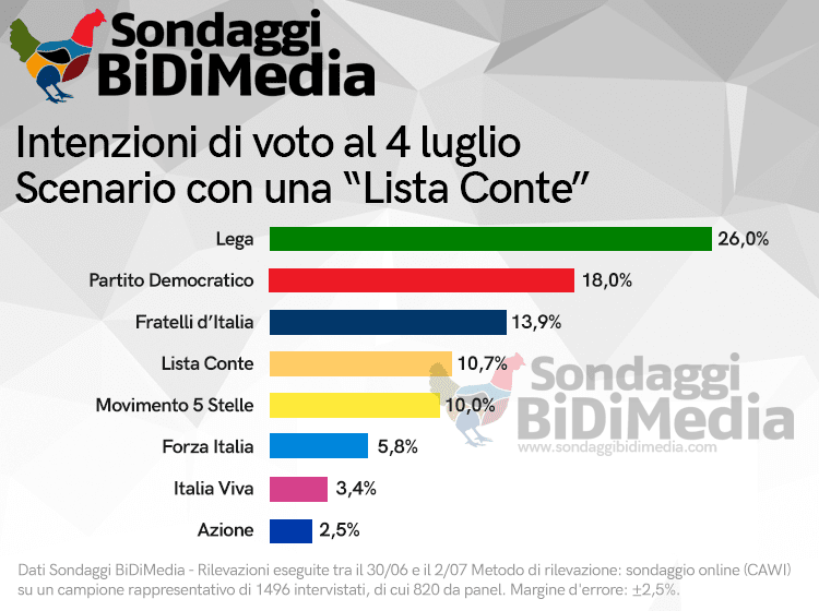 LA LISTA CONTE – Bidimedia ha sondato il terreno anche con l’eventuale presenza di una ‘lista Conte’, che varrebbe il 10,7% nelle intenzioni di voto. La Lega scenderebbe al 26%, FdI al 13,9%, in entrambi i casi perdendo pochi decimi, mentre il calo sarebbe più consistente per Pd e M5S. I Dem darebbe al premier circa il 3%, mentre i pentastellati il 5%, vedendo il loro bacino elettorale ridotto al 10% e venendo sorpassati dalla stessa ‘lista Conte’.