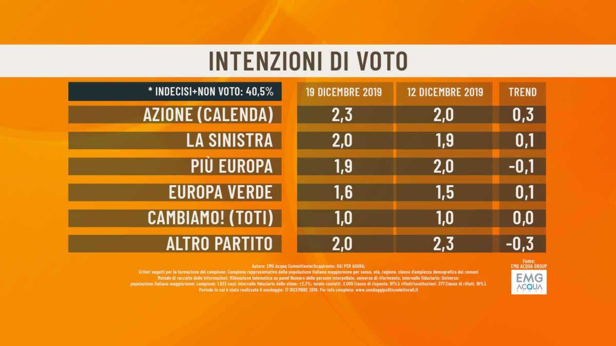 GLI ALTRI PARTITI – Per Azione, il movimento fondato dall’ex ministro Carlo Calenda, EMG attesta un risultato del 2,3% (+0,2%), mentre tra le altre formazioni minori +Europa si attesta all’1,9% ed Europa Verde all’1,6%.