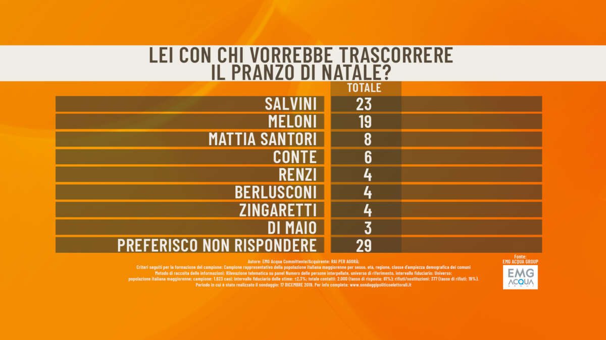 IL PRANZO DI NATALE COL POLITICO – EMG ha inoltre chiesto al suo campione con chi vorrebbe trascorrere il pranzo di Natale, una sorta di ‘questionario’ sulla fiducia nei vari leader politici. In testa a questa particolare classifica c’è ancora Matteo Salvini con il 23%, segue Giorgia Meloni (19%) e sul gradino più basso del podio c’è a sorpresa Mattia Santori, il volto delle Sardine, con l’8%. Soltanto quarto il presidente del Consiglio Giuseppe Conte (6%), seguono appaiati Matteo Renzi, Silvio Berlusconi, Nicola Zingaretti (4%) e infine Luigi Di Maio (3%). Il 29% invece ha preferito non rispondere.