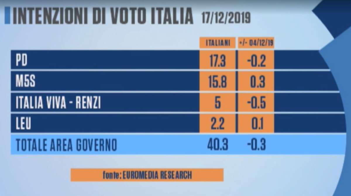 L’AREA DI GOVERNO – Nel corso della trasmissione di Rai1 condotta da Bruno Vespa la direttrice di Euromedia Research Alessandra Ghisleri ha snocciolato i dati sui due fronti politici opposti: quello di governo e quello di opposizione. Tra i partiti di maggioranza il Partito Democratico è al 17,3%, in calo dello 0,2%, mentre il Movimento 5 Stelle sale al 15,8% (+0,3%). Italia Viva di Matteo Renzi subisce un brusco calo (-0,5%) scendendo al 5%, mentre Leu è stimata al 2,2%: l’area di governo arriva al 40,3%, in calo dello 0,3%.