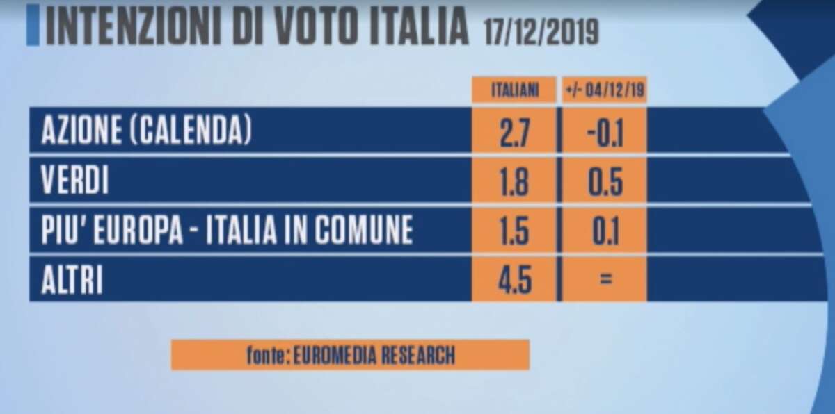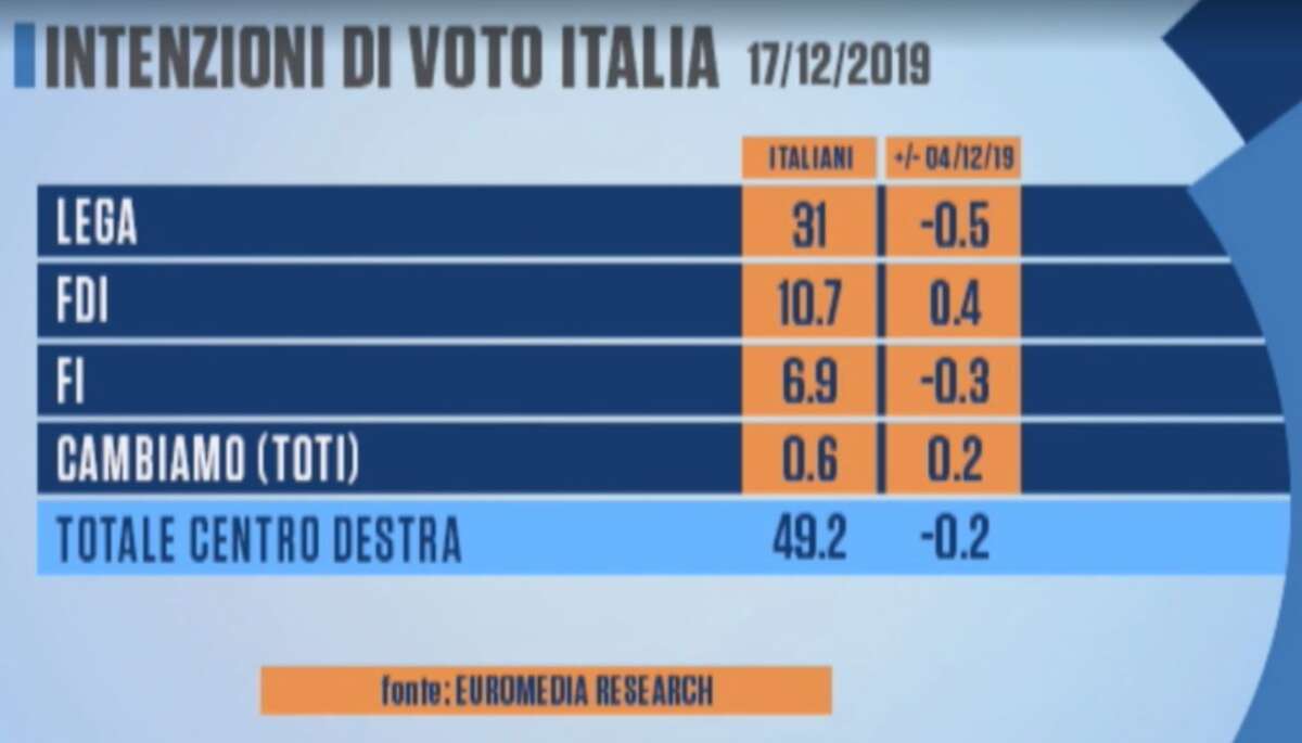 IL FRONTE DELL’OPPOSIZIONE – Nell’opposizione il Carroccio è al 31%, ma perde mezzo punto rispetto al 4 dicembre. Prosegue la scalata di Fratelli d’Italia che arriva al 10,7% (+0,4%), Forza Italia è stimata al 6,9% (-0,3%) mentre Cambiamo di Giovanni Toti raccoglie solo lo 0,6%. Il centrodestra arriva così al 49,2%, in calo dello 0,2%.