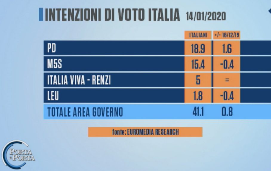 L’AREA DI GOVERNO – Il Partito Democratico, secondo l’istituto di Alessandra Ghisleri, fa un grande balzo in avanti. Il partito di Nicola Zingaretti, infatti, rispetto all’ultima rilevazione del 18 dicembre scorso guadagna 1,6 punti percentuali collocandosi al 18,9%. Il Movimento 5 Stelle, invece, ha una contrazione dello 0,4% e si ferma al 15,4%. Stabile Italia Viva di Matteo Renzi al 5%, mentre Liberi e Uguali perde lo 0,4% ed ottiene l’1,8%. In totale l’area giallo-rossa fa registrare il 41,1% con un +0,8% rispetto all’ultima rilevazione dello stesso istituto.