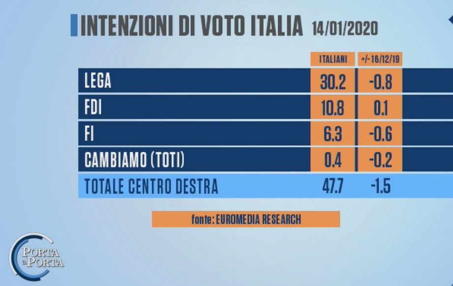 L’ultimo sondaggio dell’istituto demoscopico Euromedia Resaearch per Porta a Porta fa segnare un grande balzo in avanti di Italia Viva. Il partito fondato da Matteo Renzi, però, non riesce a trascinare l’area di governo giallo-rossa che è distante ben 6,6 punti percentuali dal centrodestra a trazione leghista.
