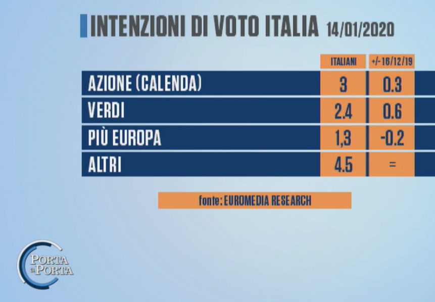 GLI ALTRI PARTITI – Tra i partiti minori Azione dell’ex ministro Carlo Calenda fa registrare un incremento dello 0,3% ed ottiene il 3%. In trend positivo anche i Verdi con il 2,4% (+0,6%), mentre cala dello 0,2% +Europa che ottiene l’1,3%.