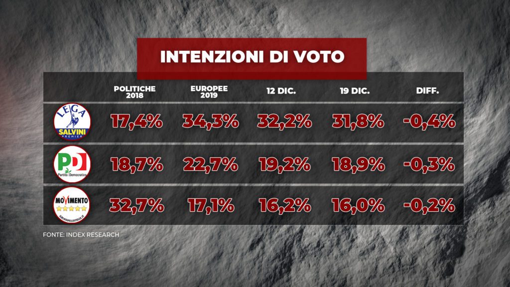 I tra partiti maggiormente rappresentati in Parlamento registrano nell’ultima settimana un calo dei consensi. A rilevarlo è il sondaggio di Index Reaserch per Piazza Pulita di La7. L’istituto infatti nei dati aggiornati al 19 dicembre vede Lega, Partito Democratico e Movimento 5 Stelle in sofferenza, a discapito dei partiti minori, soprattutto Fratelli d’Italia di Giorgia Meloni e Azione di Carlo Calenda.