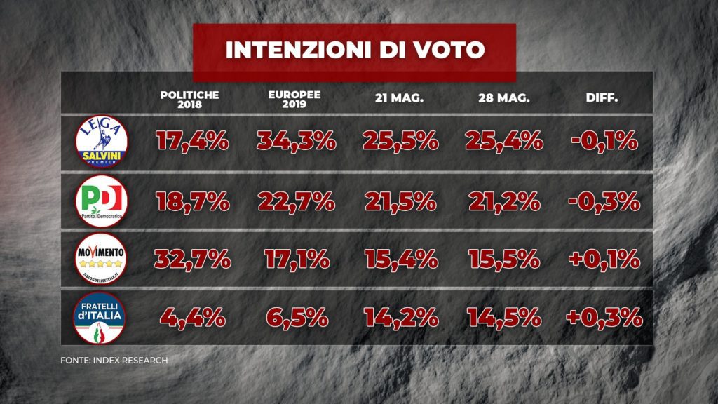 LE INTENZIONI DI VOTO – Lega e Partito Democratico sono entrambe stimate al ribasso da Index. Il Carroccio perde lo 0,1% in sette giorni attestandosi al 25,4%, mentre i Dem di Zingaretti scendono al 21,2%, in calo dello 0,3%. Dietro invece recuperano consensi il Movimento 5 Stelle, al 15,5% (+0,1%), e Fratelli d’Italia, al 14,5% (+0,3%).