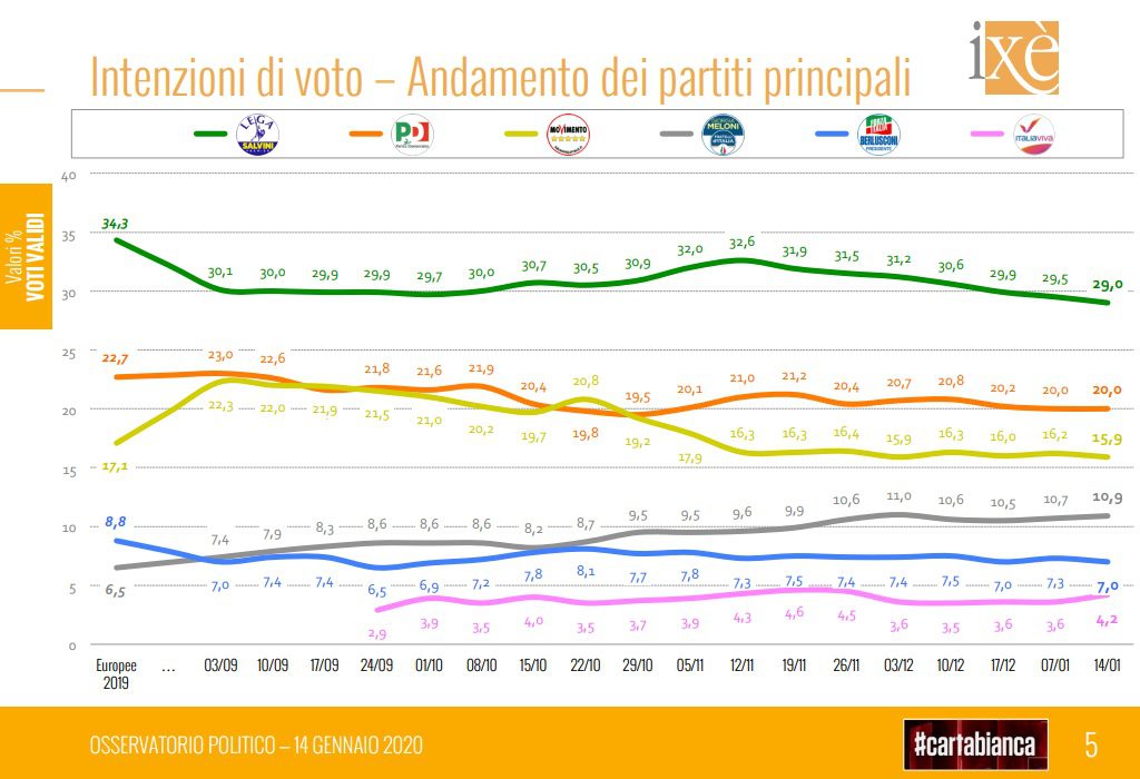 Sondaggio Ixè: cala ancora la Lega, balzo in avanti di Italia Viva