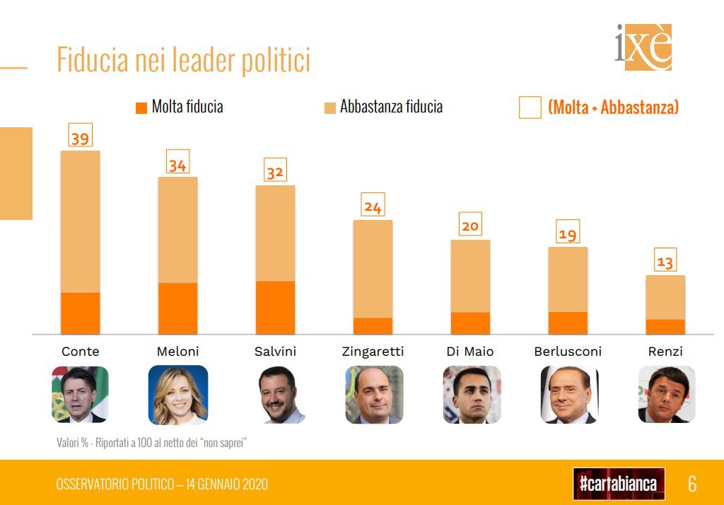 LA FIDUCIA NEI LEADER – Tra i leader il premier Giuseppe Conte mantiene il primo posto con il 39% di fiducia, mentre Giorgia Meloni, che la scorsa settimana aveva superato Matteo Salvini, consolida il secondo posto col 34% di fiducia e stacca il leader leghista che si ferma al 32%. Seguono Nicola Zingaretti del Pd al 24%, Luigi Di Maio al 20%, Silvio Berlusconi al 19% e Matteo Renzi al 13%.