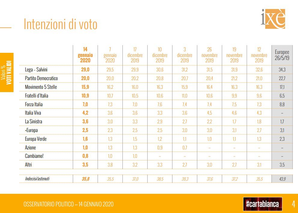 LE INTENZIONI DI VOTO – La Lega si conferma primo partito italiano ma fa registrare un ulteriore calo. La formazione di Matteo Salvini si ferma al 29% e conferma il trend negativo perdendo lo 0,5% rispetto all’ultima rilevazione. Il partito verde, infatti, fa registrare da due mesi a questa parte sempre il segno negativo rispetto alla rilevazione della settimana precedente. Al secondo posto è stabile il Partito Democratico al 20%. Il Movimento 5 Stelle, invece, perde lo 0,3% rispetto alla scorsa rilevazione dello stesso istituto e si ferma al 15,9%. Fratelli d’Italia, ormai stabilmente in doppia cifra, è accreditato del 10,9%, mentre Forza Italia è data al 7%. Balzo in avanti, questa settimana, per Italia Viva. Il partito lanciato dall’ex premier Matteo Renzi è preferito dal 4,2% degli intervistati, facendo registrare ben lo 0,6% in più rispetto alla scorsa rilevazione.