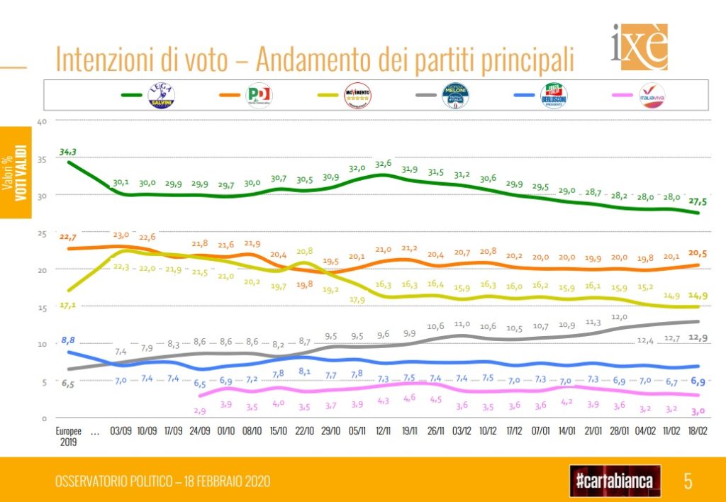 LE INTENZIONI DI VOTO – La Lega si conferma primo partito ma continua il suo trend negativo. Se tra il 4 e l’11 febbraio il partito di Matteo Salvini si era almeno stabilizzato sul 28%, con la rilevazione del 18 febbraio, invece, perde ancora uno 0,5% e si ferma al 27,5%. Ne approfitta il Partito Democratico che guadagna lo 0,4% e sale al 20,5% riducendo, in questa rilevazione, le distanze a 7 punti percentuali. Stabile per questa settimana il Movimento 5 Stelle al 14,9%, tallonato da Fratelli d’Italia che è 2 punti dietro col 12,9%. Forza Italia guadagna qualcosina e sale al 6,9), mentre Italia Viva perde lo 0,2% e si ferma al 3%.