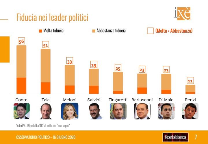 LA FIDUCIA NEI LEADER – La fiducia nel Presidente del Consiglio Giuseppe Conte scende di un punto anche questa settimana, attestandosi sul 56%. Si avvicina il Presidente del Veneto, Luca Zaia, con un gradimento del 51%. Più indietro Meloni (33%) e Salvini (29%). Arretra di 2 punti la fiducia in Di Maio (23%), superato da Zingaretti (25%) e appaiato a Berlusconi (23%).