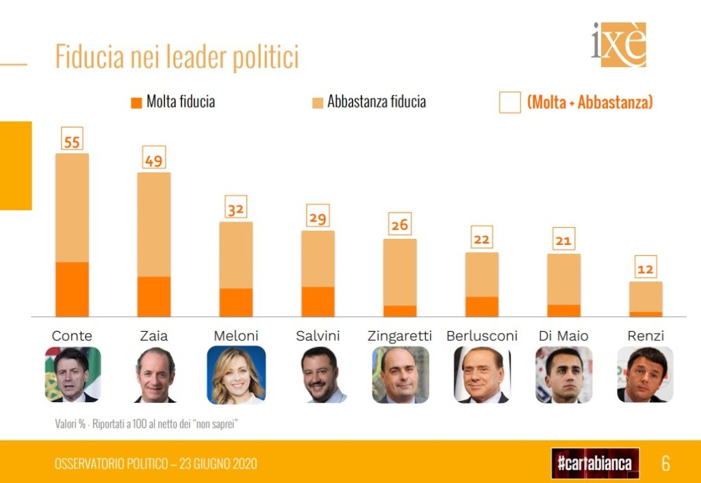 LA FIDUCIA NEI LEADER POLITICI – Giuseppe Conte continua a primeggiare in questa particolare classifica. Il premier, infatti, può godere del 55% di fiducia da parte degli italiani. Al secondo posto c’è, ormai stabile, Luca Zaia con il 49% della fiducia e che supera di ben 20 lunghezze il leader del suo partito Matteo Salvini. Tra i due leghisti si colloca, al 32%, Giorgia Meloni, mentre al 26% c’è Nicola Zingaretti del Partito Democratico. Seguono Silvio Berlusconi (22%), Luigi Di Maio (21%) e Matteo Renzi (12%).
