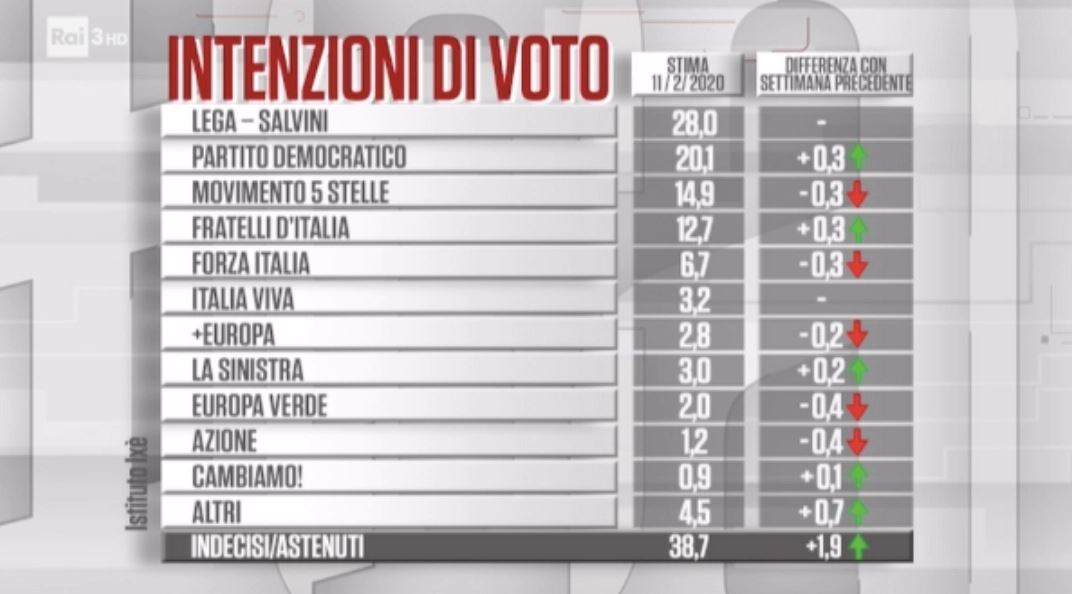 I FLUSSI ELETTORALI – Il Carroccio viene stimato da Ixè al 28%, mentre il Partito Democratico supera quota 20 attestandosi al 20,1% (+0,3%). Ancora male i 5 Stelle, che perdono lo 0,3% e scendono fino al 14,9%, ormai tallonato da Fratelli d’Italia che guadagna lo 0,3% e arriva fino al 12,7%.