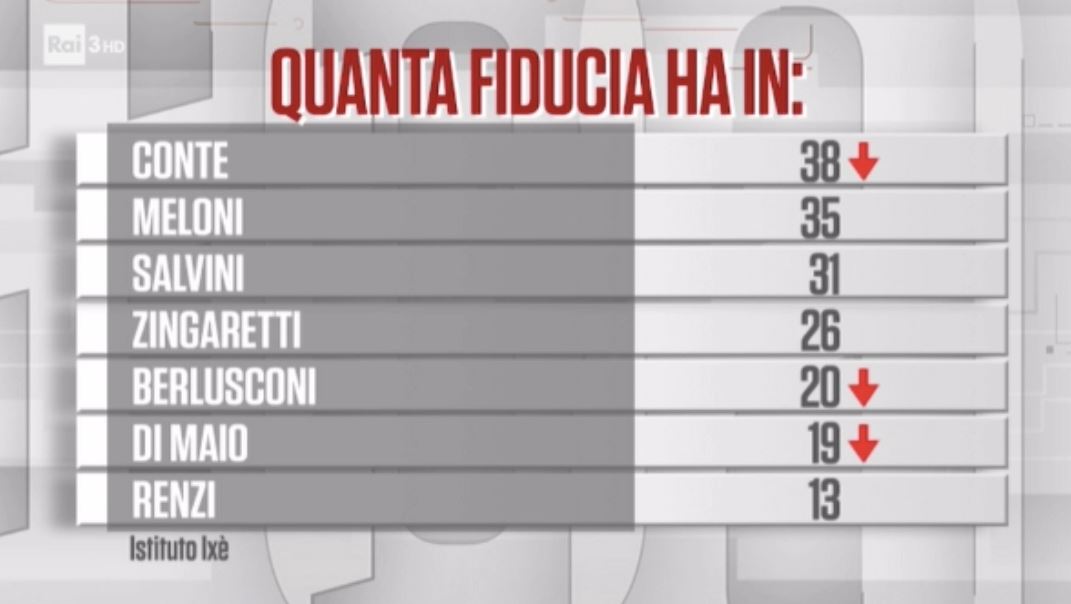 LA FIDUCIA NEI LEADER – Ixè ha chiesto nel suo sondaggio anche della fiducia degli italiani nei vari leader politici. Il premier Giuseppe Conte è ancora al primo posto al 38%, in calo però rispetto alla scorsa settimana. Dietro il presidente del Consiglio sono stabili Giorgia Meloni (35%), Matteo Salvini (31%) e Nicola Zingaretti (26%). In calo invece la fiducia per Berlusconi e Di Maio, che restano comunque davanti a Matteo Renzi.