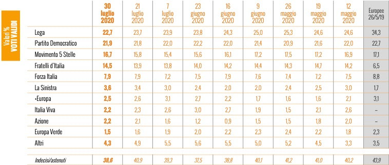 Dietro il partito che cresce maggiormente è il Movimento 5 Stelle, che guadagna quasi un punto risalendo al 16,7%. Subito sotto il ‘podio’ c’è Fratelli d’Italia: il partito di Giorgia Meloni è il grande protagonista della settimana assieme ai grillini, aumenta il suo consenso dello 0,6% portandosi dal 3,9% al 14,5%.