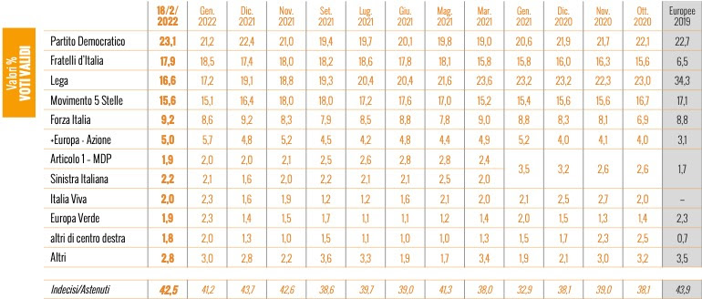 L’ultima rilevazione, tra il 28 e il 31 gennaio. Rispetto ad allora il Partito Democratico sale dal 21,2% al 23,1%: è record da maggio 2019. I punti di distacco da Fratelli d’Italia – partito alla guida dell’opposizione del governo Draghi – superano i cinque. Il partito di Giorgia Meloni è sceso dal 18,5% al 17,9%. Stesso calo per la Lega dal 17,2% al 16,6%. Tendenza quindi comune per i separati in casa nel centrodestra Meloni e Matteo Salvini.