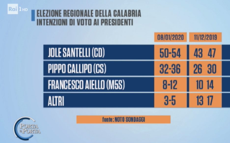 Secondo le intenzioni di voto Jole Santelli, deputata e coordinatrice regionale di Forza Italia, si attesterebbe in una forbice di voto tra il 50 e il 54%. Callipo si fermerebbe tra il 32 e il 36%, circa 20 punti sotto l’avversaria di centrodestra. Il candidato del Movimento 5 Stelle, il docente universitario Francesco Aiello, viene stimato da ‘Noto’ tra l’8 e il 12%. Carlo Tansi, ex capo della Protezione civile regionale e candidato ‘civico’ alle Regionali, raccoglierebbe soltanto il 3-5% dei consensi.