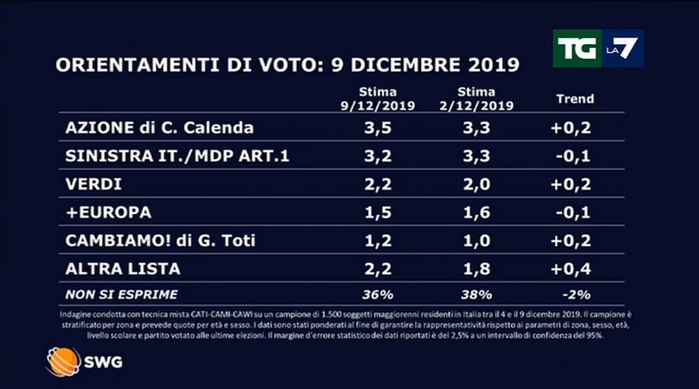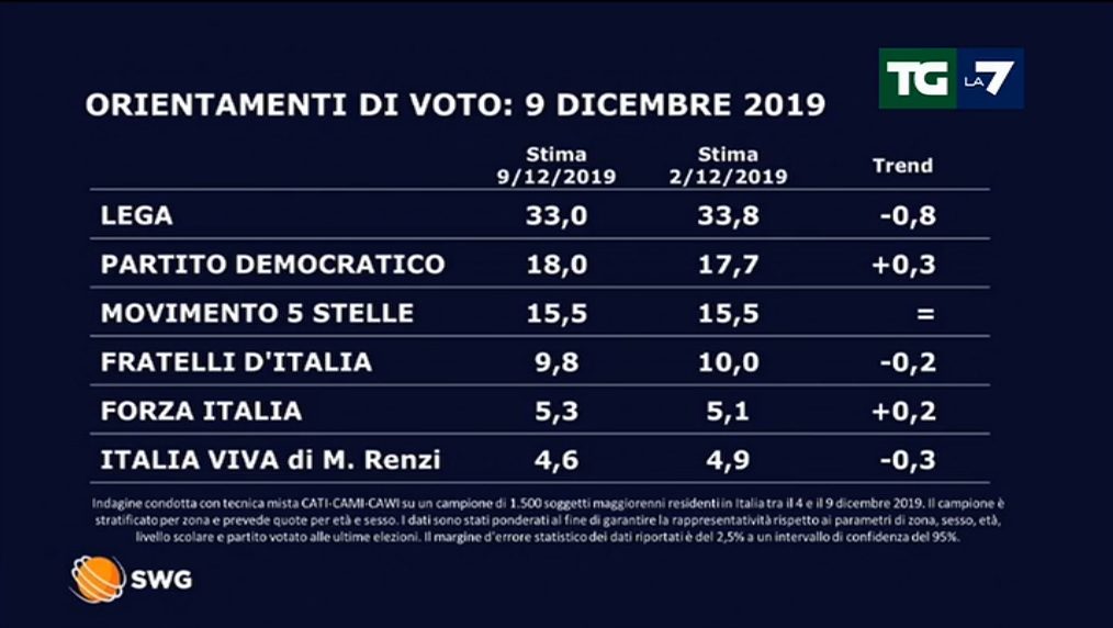 Pubblicato l’ultimo sondaggio Swg per il La7. Secondo la rilevazione dell’istituto di ricerca la Lega è saldamente primo partito mentre Partito Democratico e Movimento 5Stelle non arrivano al 20%. Interessante il dato riguardante il potenziale Partito delle Sardine che oltre a riempire le piazze riempirebbe anche le urne.