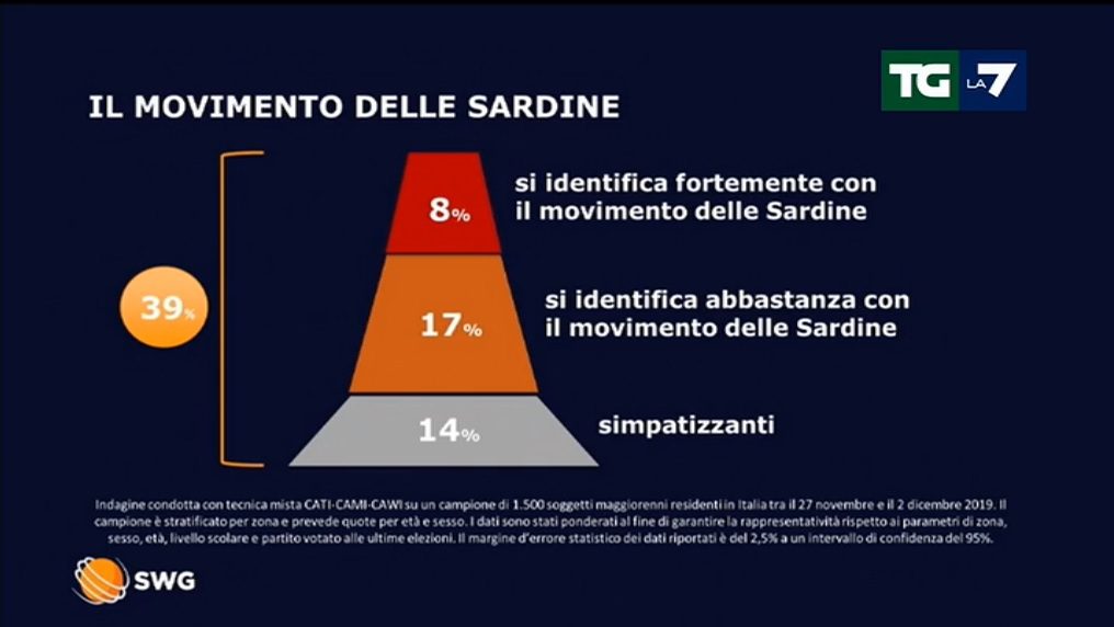 IL PARTITO DELLE SARDINE – Interessante il dato riguardante il potenziale Partito delle Sardine. Il movimento, che nell’ultimo mese ha riempito le piazze di tutta Italia, potrebbe raccogliere tanto e riempire anche le urne. Infatti la formazione di Mattia Santori, nel sondaggio condotto da Swg, può contare su un 39% di simpatizzanti. Tra questi il 17% si identifica abbastanza nell’eventuale partito, mentre l’8% sarebbe la base elettorale. Un risultato di tutto rispetto per un movimento che non sa ancora cosa vorrà fare da grande.