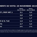 Seguono Sinistra Italiana con il 3,1%, i Verdi al 2, +Europa all’1,6, Cambiamo! di Giovanni Toti all’1,3.