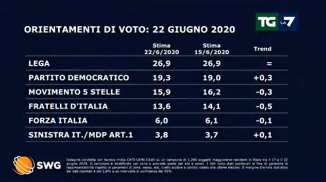 Male invece Giorgia Meloni e Fratelli d’Italia, che cala di mezzo punto in sette giorni attestandosi al 13,6%, vedendo allungarsi la distanza dai pentastellati. Forza Italia resta sostanzialmente stabile al 6 per cento (-0,1%), percentuale che guadagna invece la Sinistra che sale al 3,8%.