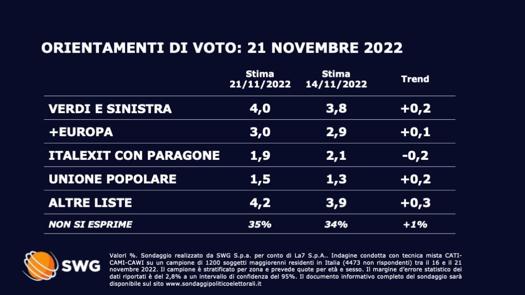 Il Movimento di Giuseppe Conte perde però uno 0,1% scendendo al 16,9 per cento. Tra i partiti cosiddetti ‘minori’ vanno registrati piccoli movimenti: Verdi e Sinistra Italiana passano dal 3,8% della scorsa settimana al 4%, mentre +Europa arriva al 2,9% (+0,1%).