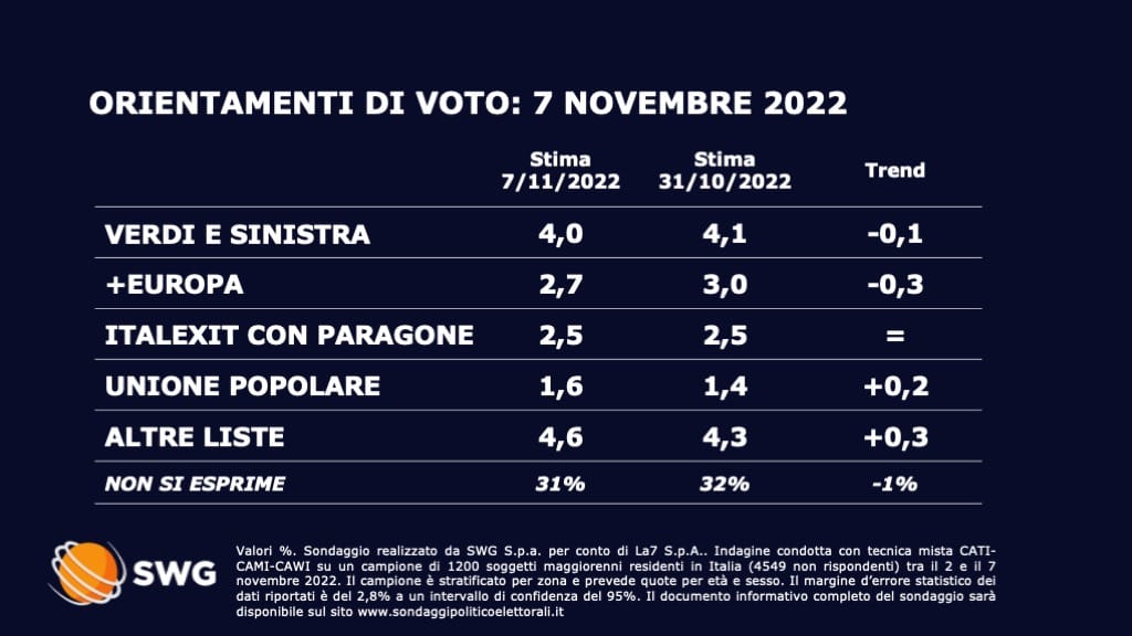 Verdi e Sinistra, l’alleanza ‘cocomero’ che sta puntando molto su una opposizione identitaria all’esecutivo Meloni, non viene premiata dagli elettori: secondo Swg è al 4 per cento, in calo di un decimale. Alle sua spalle ci sono +Europa (2,7%), ItalExit (2,5%), Unione Popolare (1,6%).