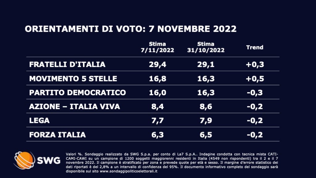 Sondaggio Swg per La7, Meloni verso quota 30 per cento e Conte sopra Letta: il PD sprofonda ai risultati di ottobre 2018