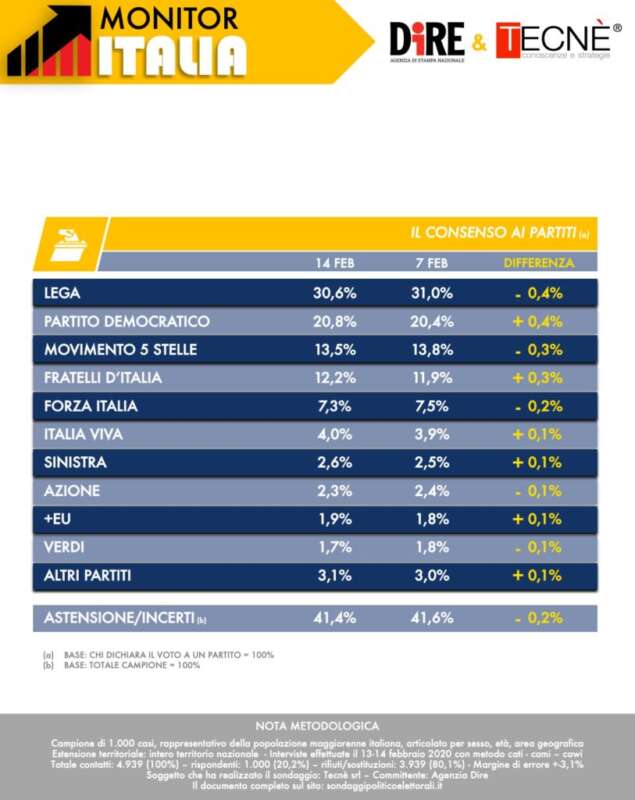 LE INTENZIONI DI VOTO – Per quanto riguarda i dati dei partiti, continua il prosegue negativo della Lega. Il Carroccio di Matteo Salvini perde un ulteriore 0,4% nell’ultima settimana e si attesta al 30,6%. La stessa percentuale è invece guadagnata dal Partito Democratico che risale al 20,8%. Così come la Lega anche il Movimento 5 Stelle continua imperterrito la sua crisi di consenso: i grillini scendono al 13,5% e calano ancora dello 0,3% in sette giorni. Proprio Di Maio e soci sono ormai nel mirino di Fratelli d’Italia, che accresce i suoi numeri e sale al 12,2% (+0,3%).