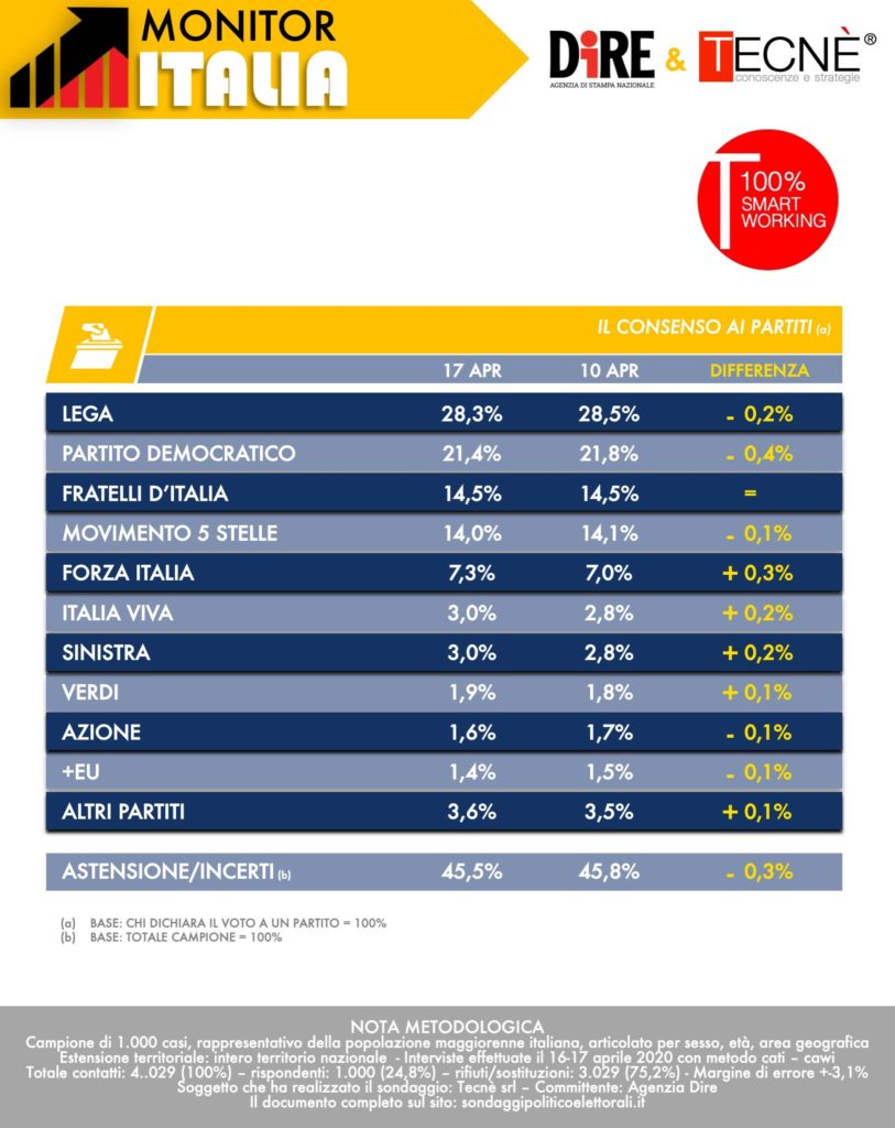 I DATI DEI PARTITI – Lega e Partito Democratico segnano un calo nei rispettivi consensi. Per il Carroccio di Matteo Salvini la discesa è dello 0,2% al 28,3%, mentre i Dem di Nicola Zingaretti perdono addirittura lo 0,4% e calano fino al 21,4%. Stabile invece il dato di Fratelli d’Italia, con Meloni e soci al 14,5% che si consolida al terzo posto ai danni del Movimento 5 Stelle, che perde un ulteriore 0,1% venendo stimato ora al 14% da Tecnè.