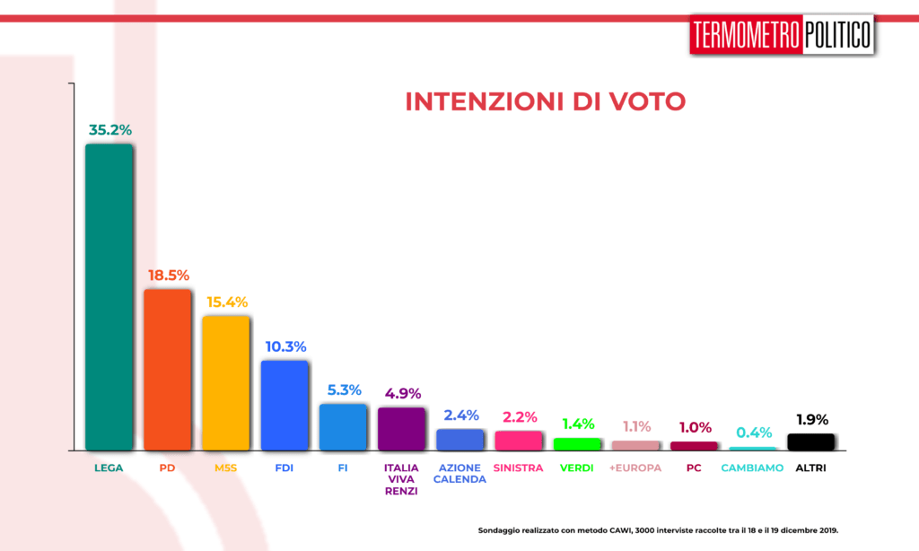 I PARTITI MAGGIORI – Il partito di Matteo Salvini sfonda il muro del 35%, solamente sfiorato nell’ultima rilevazione, salendo al 35,2%. Segue il Partito Democratico con il 18,5, che rispetto alla scorsa rilevazione perde solo uno 0,1% così come il Movimento 5 Stelle al 15,5%. Guadagna lo 0,1%, invece, Fratelli d’Italia che si posiziona come quarto partito al 10,3%. In calo Forza Italia, che passa dal 5,5% al 5,3%, e Italia Viva di Matteo Renzi, che dal 5,3% passa al 4,9%.