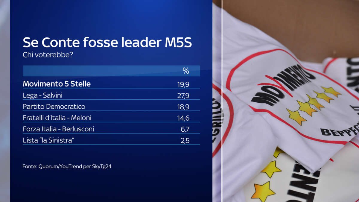 Se invece Giuseppe Conte si presentasse alle elezioni come leader del Movimento 5 Stelle, la Lega sarebbe il primo partito col 27,9%, il M5S scavalcherebbe il Pd col 19,9%, i Dem scenderebbero quindi al terzo posto col 18,9%. Tra gli altri partiti Fratelli d’Italia otterrebbe il 14,6%, Forza Italia il 6,7%, La Sinistra il 2,5%, Azione! il 2,2%, Italia Viva il 2,1%.