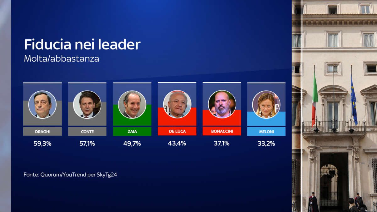Quanto alla fiducia nei leader politici, gli italiani premiano due personaggi non a capo di un partito: il primo è infatti l’ex presidente della Bce Mario Draghi (59,3%), alle sue spalle c’è il premier Giuseppe Conte con il 57,1%. Dietro troviamo i governatori del Veneto Zaia (49,7%), Campania De Luca (43,4%) ed Emilia Romagna Bonaccini (37,1%). Alle loro spalle la leader di Fratelli d’Italia Giorgia Meloni (33,2%), seguita da Matteo Salvini (31,2%) e Zingaretti al 30,4%.