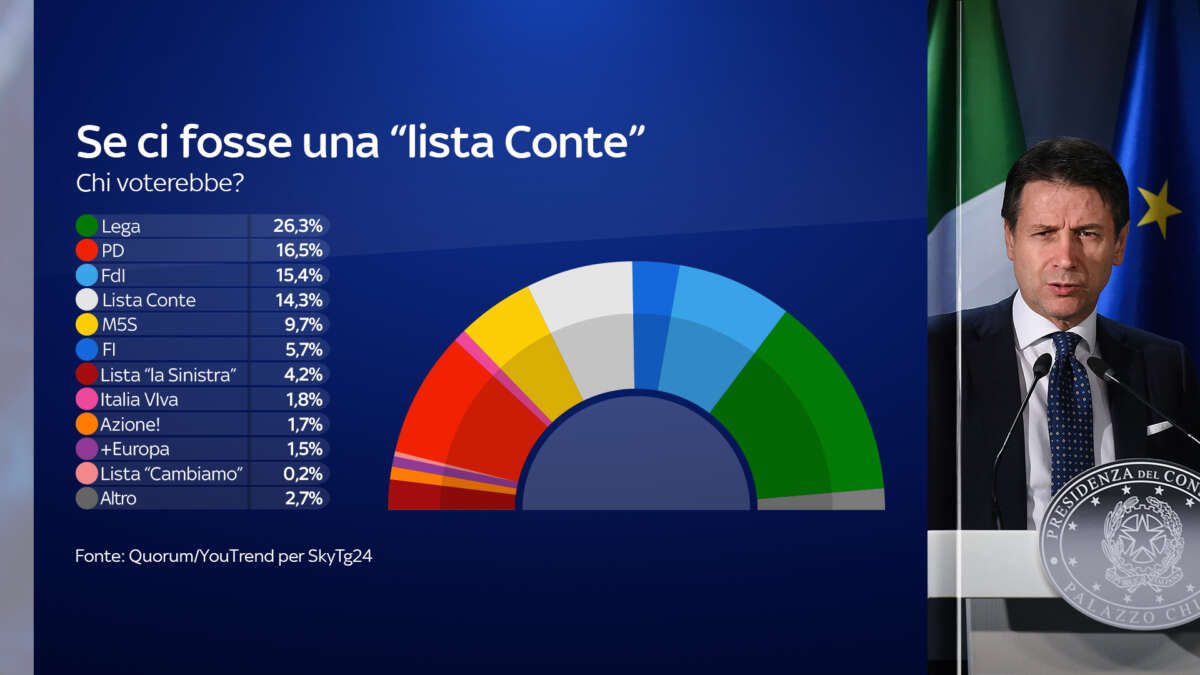 Secondo Quorum/YouTrend, in caso di “lista Conte” sarebbe comunque la Lega il primo partito in Italia. Il Carroccio otterrebbe il 26,3%, il Pd il 16,5% e Fratelli d’Italia il 15,4%, gli unici tre partiti in grado di superare il partito del premier. Alle spalle di Conte il Movimento 5 Stelle, al 9,7%, Forza Italia al 5,7%, la Sinistra al 4,2% e Italia Viva all’1,8%.