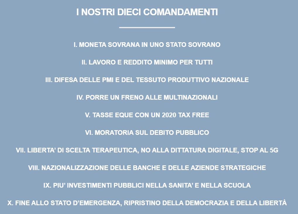 Un programma politico che non disdegna slogan forti, facendo appello alla disobbedienza civile, citando nel suo manifesto online il principio che Giuseppe Dossetti formalizzò all’Assemblea Costituente del 1946: “La resistenza individuale e collettiva agli atti dei poteri pubblici, che violino le libertà fondamentali e i diritti garantiti dalla presente Costituzione, è diritto e dovere di ogni cittadino”.