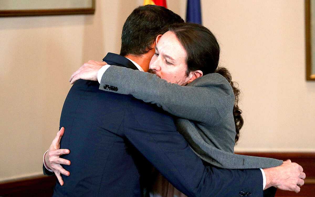 Manca un pugnale. Gli occhi chiusi e le cinque dita della mano di un pallido Pablo Iglesias ben aperte a toccare quanta più superficie possibile del corpo estraneo. Lo slancio dell’abbraccio del recalcitrante Iglesias verso Pedro Sanchez, rigido come un tubo idraulico e mezzo metro più alto, ha strappato un “ooooooooooohh” di burla ai fotografi presenti. La sfilza reciproca dei “con lui mai, non mi fido di quest’uomo” è lunga. Va dal “con ministri di Podemos io non dormirei più la notte” (Pedro Sanchez il giorno di convocazione delle elezioni anticipate del 10 novembre). Al “Chissà se dorme tranquillo adesso che 50 deputati di estrema destra sono entrati in Parlamento”. (Pablo Iglesias la notte dopo il voto). Il governo delle sinistre in Spagna ci sarà. L’ha messo su Pedro Sanchez, il segretario dei socialisti uscito vincitore dalle primarie del congresso Psoe, il partito socialista spagnolo, proprio con la promessa di trovare un accordo di governo con gli ex movimentisti di Podemos, in realtà strutturati in un partito dalle imbracature rigidissime nel quale o si sta e si tace, o si esce.