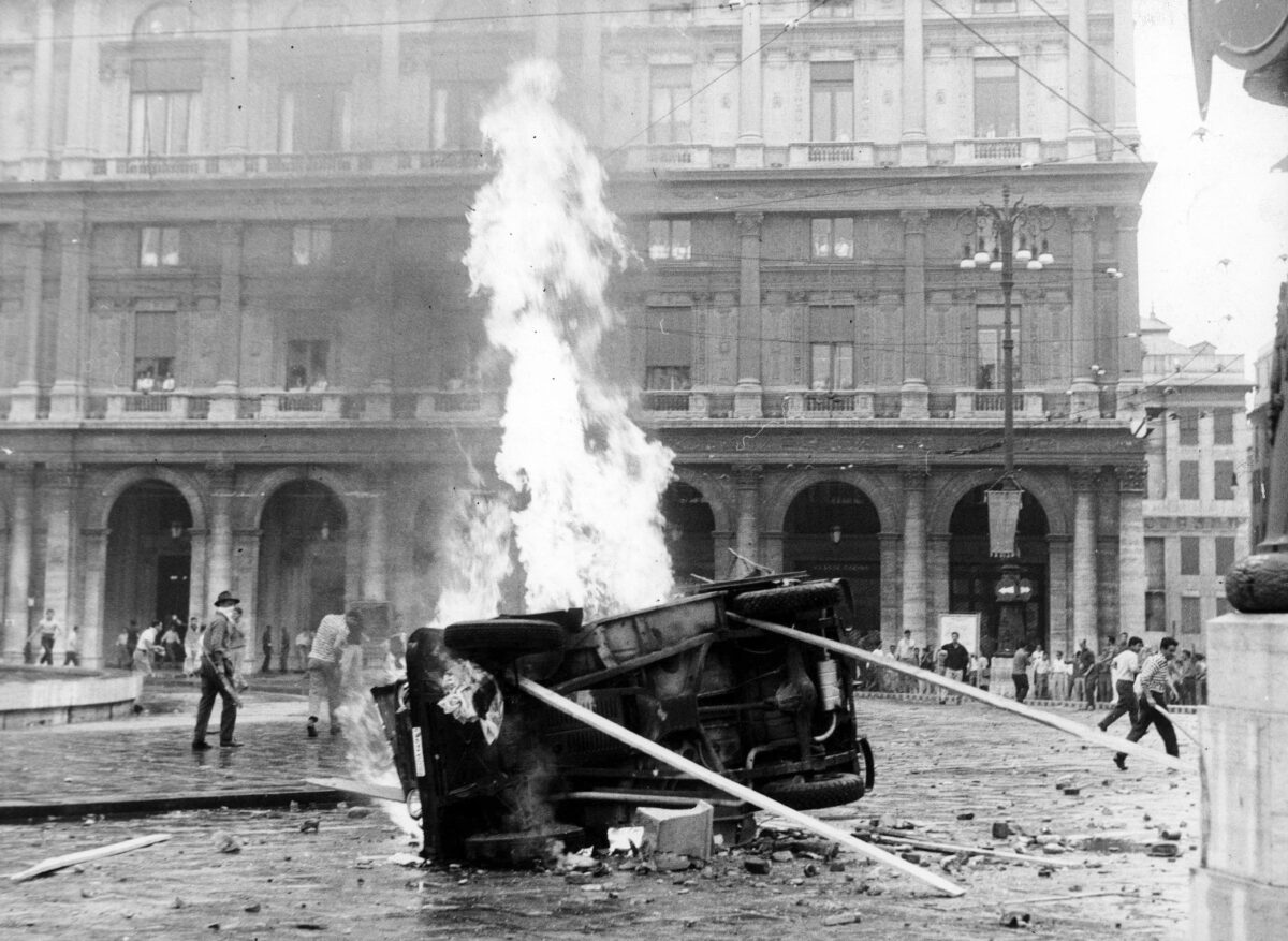 La miscela esplosiva era pronta. Gli ex partigiani avevano già tirato fuori le armi. Primo Moroni, allora giovane militante arrivato da Milano per la manifestazione, ricordava: «Avevano piazzato un cannoncino 120 montato su un camion degli ortolani a controllare la strada. C’erano armi che non sono state usate, non si è sparato, sono state usate come deterrente». La Uil si era dichiarata contraria allo sciopero generale dichiarato della Cgil, la Cisl aveva lasciato libertà di scelta, la partecipazione alla manifestazione era straripante. Nonostante le premesse il corteo si svolse senza incidenti. I primi incidenti partirono a manifestazione conclusa, quando alcuni dei manifestanti iniziarono a insultare e tirare sassi contro la polizia presente in forze in piazza Ferraro. La polizia rispose con gli idranti, poi con le cariche del battaglione Padova. I genovesi erano pronti alla battaglia. Se la aspettavano. Erano preparati. I portuali tirarono fuori i rampini, contrattaccarono precipitando nella fontana al centro della piazza i celerini. Uno dei comandanti rischiò di essere affogato: fu salvato di misura dagli stessi organizzatori del corteo. Gli scontri proseguirono nei carrugi, i vicoli di Genova.