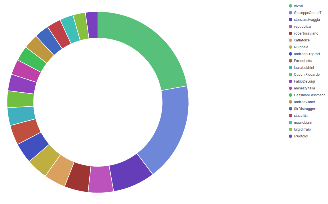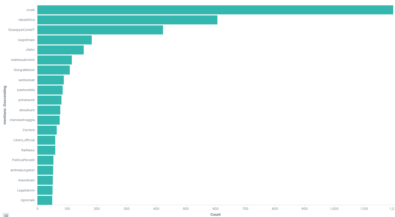 Le menzioni invece dicono altro e non è un caso che oltre ai protagonisti in positivo Civati e Conte, separati da Repubblica, ed un defilato Di Maio in quarta posizione, troviamo gli elementi di spicco della destra sui quali sono piovute molte critiche: Feltri, Salvini e Meloni ed i profili di Sallusti, Lega e Giornale. Spazio minimo per Purgatori e Lucarelli.