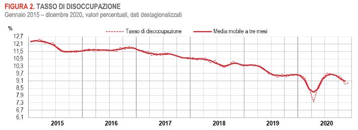 “A dicembre – commenta l’Istat – l’occupazione torna a diminuire, interrompendo il trend positivo che tra luglio e novembre aveva portato a un recupero di 220 mila occupati; il calo occupazionale è concentrato sulle donne e coinvolge sia i dipendenti sia gli autonomi. Inversione di tendenza anche per la disoccupazione che, dopo quattro mesi di progressivo calo, torna a crescere portando il tasso al 9%. I livelli di occupazione e disoccupazione sono inferiori a quelli di febbraio 2020 – rispettivamente di oltre 420 mila e di quasi 150 mila unità – e l’inattività risulta superiore di oltre 400 mila unità. Rispetto a febbraio 2020, il tasso di occupazione è più basso di 0,9 punti percentuali e quello di disoccupazione di 0,4 punti”.