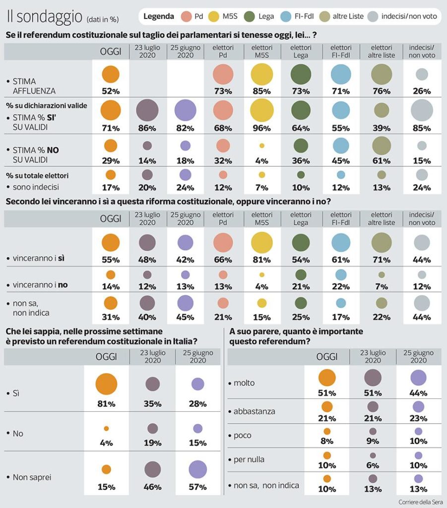 Per quanto riguarda il risultato, secondo Pagnoncelli il risultato appare scontato, nonostante le numerose defezioni da una parte all’altra del Parlamento da deputati e senatori che dal fronte del sì si sono spostati su posizioni contrarie. Ipsos rileva infatti che il 71% degli intervistati voterà a favore del taglio dei parlamentari e il 29% contro, mentre il 17% degli indecisi non sembrano poter ribaltare il risultato. Percentuali per il Sì in calo rispetto alle rilevazioni del 23 luglio, quando la partita si giocava su un 86% per il Sì e il 14% con il No.
