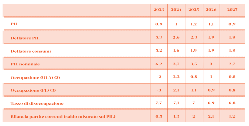 Nel corso del triennio la spesa delle famiglie sarà favorita secondo il DEF dal buon andamento del mercato del lavoro, dai rinnovi dei contratti, dalla corresponsione degli arretrati nel pubblico impiego (in particolare nel 2024), nonché dal rallentamento dell’inflazione. Nel triennio 2024-2026 il DEF prevede che gli investimenti si espandano ad un tasso superiore a quello del PIL, grazie all’impulso del PNRR. “Il rapporto tra investimenti totali e PIL crescerebbe lungo tutto l’orizzonte previsivo, raggiungendo il 21,3 per cento a fine periodo”. In crescita robusta le esportazioni, con un picco nel 2025, in linea con la ripresa dei mercati esteri rilevanti per Italia. Il saldo di parte corrente della bilancia dei pagamenti in percentuale del PIL raggiungerebbe il 2,2 % nel 2027. La previsione macroeconomica tendenziale è stata validata dall’Ufficio Parlamentare di Bilancio (UPB) come previsto dalla legge. L’UPB, tuttavia, ha reso noto che la validazione è stata data “assumendo il graduale venire meno delle tensioni geopolitiche internazionali” oltre alla “piena e tempestiva realizzazione del Pnrr”. Del resto nello stesso DEF si afferma che eventuali tensioni persistenti per tutto il 2024 nel Mar Rosso potrebbero ridurre la crescita reale di quasi due decimali (-0,18).