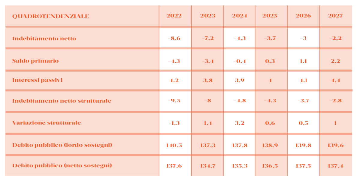 Le previsioni tendenziali di finanza pubblica per gli anni 2025 e 2026 sono più alte di 0,1. p.p. rispetto agli obiettivi programmatici della NADEF, 3,7% nel 2025 e 3,0% nel 2026. Nel 2027 il deficit sarebbe pari al 2,2% del PIL. Le previsioni tendenziali confermano, quindi, il progressivo rientro dell’indebitamento netto sul PIL lungo tutto l’orizzonte di previsione nonostante la crescita della spesa per interessi sul PIL causata dalla politica monetaria restrittiva. Il saldo primario tendenziale appare in netto miglioramento, passando dal -3,4% del 2023 al -0,4 per cento del 2024, poi al +0,3% del 2025 e al +2,2% del 2027. Ruolo importante nel forte miglioramento del 2024 lo ha avuto la cessazione delle misure emergenziali legate alle crisi pandemica ed energetica, mentre negli anni successivi lo avrà anche la netta riduzione prevista degli oneri relativi ai bonus edilizi. Per quanto riguarda il debito pubblico il confronto con la NADEF va fatto sul profilo temporale più che sull’entità data la revisione operata dall’Istat. Come già detto, infatti, mentre la NADEF fissava il debito 2023 a un livello 140,2, la nuova stima del deflatore del PIL 2023 ha portato il valore del debito 2023 a 137,3. La NADEF prevedeva un debito sostanzialmente stabile nel 2024/25 con una discesa a 139,6 nel 2026. Il nuovo tendenziale prevede invece un aumento del debito fino al 2026 (139,8), per poi iniziare a scendere. Causa di questo andamento, secondo il DEF, “le minori entrate legate alle ingenti compensazioni d’imposta previste per via dei vari incentivi fiscali introdotti negli ultimi anni che, aggravando il fabbisogno di cassa, peggiorano il profilo del debito”.