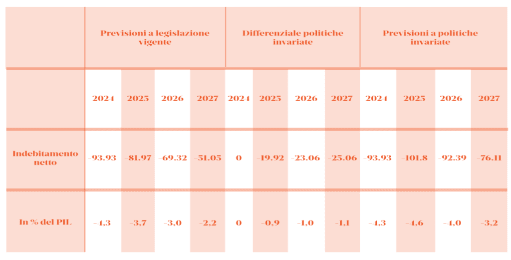 Nella conferenza stampa il ministro del Tesoro ha fatto alcune affermazioni da DEF “programmatico” dicendo che obiettivo prioritario del governo nella prossima legge di bilancio è la conferma del taglio del cuneo contributivo. Essendo una misura finanziata solo per il 2024, l’annuncio ha un valore programmatico. Giorgetti ha anche detto che saranno rispettati gli obiettivi di deficit programmatici indicati dalla NADEF 2023. E qui nasce un problema e, probabilmente, c’è la seconda motivazione della mancanza della parte programmatica del DEF. Gli obiettivi di deficit programmatici indicati nella NADEF contenevano nel 2024 tutta una serie di misure varate con la legge di bilancio approvata alla fine del 2023, ma finanziate solo per il 2024, per un ammontare di circa 20 miliardi. Tra queste il taglio del cuneo, l’accorpamento delle aliquote Irpef, l’aiuto per le madri con due figli, la riduzione del canone Rai, le missioni all’estero.