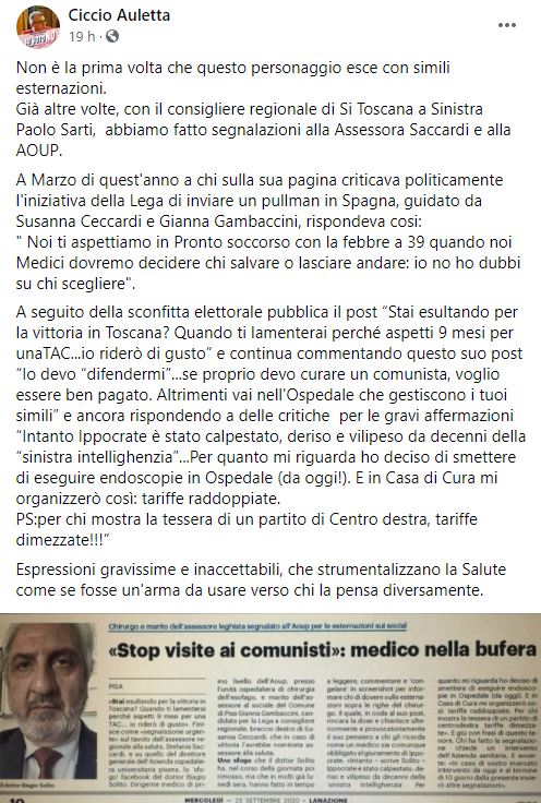 Ma le parole gravi di Solito rischiano di avere ripercussioni importanti. Le parole e il post incriminato del medico sono infatti finite con una segnalazione anonima sulla scriva dell’assessore regionale alla Salute Stefania Saccardi e su quella del direttore generale dell’Azienda ospedaliera universitaria pisana, con la richiesta di provvedimenti contro il medico.