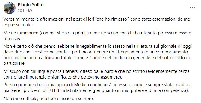 Parole che hanno provocato una ondata di sdegno e hanno costretto lo stesso Solito a fare una repentina marcia indietro a 24 ore del ‘guaio social’. Sempre su Facebook il medico ha definito le affermazioni “espresse male” e per questo ha chiesto scusa “a chi ha ritenuto potessero essere offensive”. “Non è certo ciò che penso, sebbene innegabilmente io stesso nella rilettura sul giornale di oggi devo dire che – così come scritte – portano a ritenere un atteggiamento e un comportamento poco incline ad un altruismo totale come è l’indole del medico in generale e del sottoscritto in particolare”, ha scritto ancora il medico.