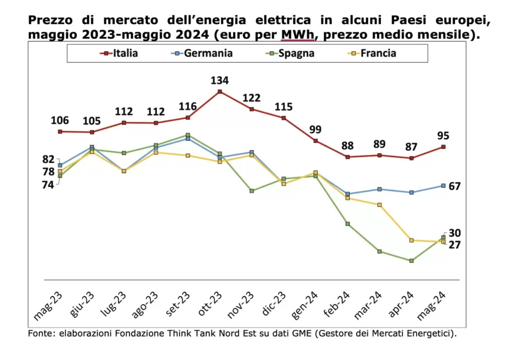 Il primo grande vulnus per chi produce in Italia è il costo energetico. Basta consultare una qualsiasi analisi dei costi, da Confindustria al Gestore dei Mercati energetici, per capire come nel nostro paese si paghi, in media, il 30 per cento in più rispetto agli altri paesi Europei. In Spagna, ad esempio, il costo dell’energia è pari a circa il 68 per cento in meno che in Italia; che in Germania la differenza è un meno 29 per cento a favore dei tedeschi e in Francia addirittura meno 70 per cento (i dati sono riferiti alle quotazioni di maggio 2024). Significativo è il caso spagnolo. Negli ultimi trent’anni, infatti, Madrid ha attuato una seria politica di energie rinnovabili facendo cadere il prezzo cosa che, ad esempio, non è successa in Italia. Si capisce bene, dunque, che avendo la possibilità di risparmiare un’azienda preferisca insediarsi in un paese dove ha una bolletta energetica più bassa.